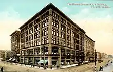 The 1896 sandstone building located on Queen Street slightly west of Yonge Street was built by Toronto firm of Burke and Horwood for Simpson's Department Store in the Romanesque Revival style with Chicago School influences.[1][2] The fireproof steel frame structure replaced the original 6-storey store that burned in 1895 just three-months after opening.[3] The store was built to replace the original Simpson's dry goods business at 184 Yonge Street [4] and was located directly across from rival retailer's Eaton's Annex.