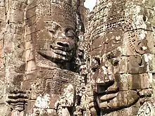 The Bayon (Khmer: ប្រាសាទបាយ័ន, Prasat Bayoăn [praːsaːt baːjŏən]) is a richly decorated Khmer temple related to Hinduism at Angkor in Cambodia. Built in the late 12th or early 13th century as the state temple of the King Jayavarman VII (Khmer: ព្រះបាទជ័យវរ្ម័នទី ៧), the Bayon stands at the centre of Jayavarman's capital, Angkor Thom (Khmer: អង្គរធំ).[1][2]