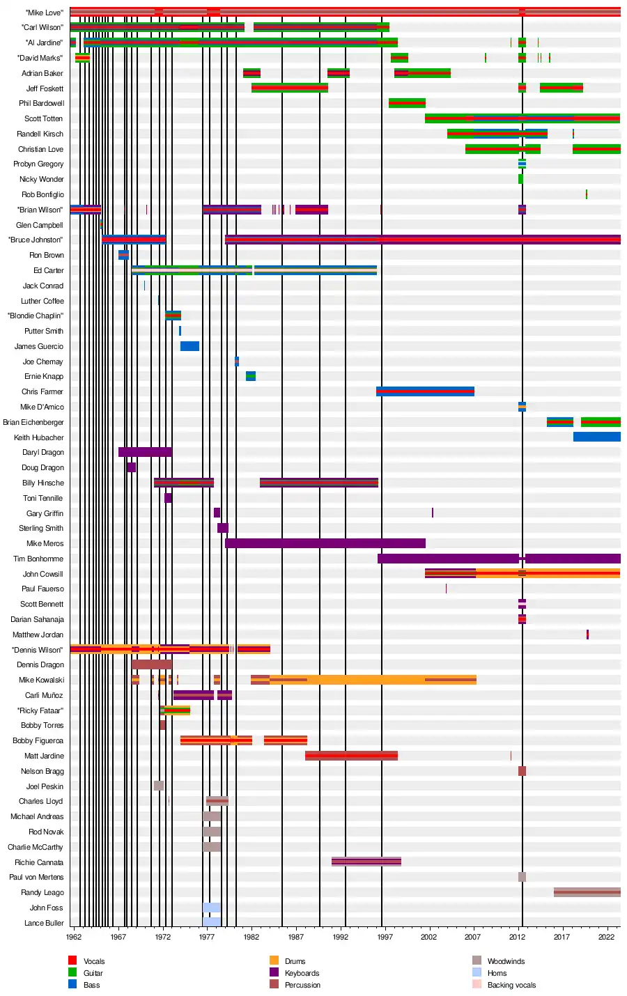 - Brian Wilson – vocals, bass, piano, organ, keyboards, electric piano, drums, timpani[34] (1961–1964, 1976–1983, 2011–2012; occasional special guest 1965, 1967, 1970, 1984–1990, 1995, 1996, 2023)