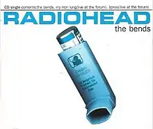 More than a year after the release of The Bends, the title track was released as a single by Parlophone in Ireland on 26 July 1996,[69] the same month when Radiohead began recording their then-upcoming third album, OK Computer (1997).[70] The single was limited to only 2,000 copies and included live versions of "My Iron Lung"[lower-alpha 3] and "Bones",[71] both recorded at the London Forum on 24 March 1995.[62][72] The single reached number 26 on the Irish Singles Chart on 1 August 1996, staying for only one week.[73] It was later made available for purchase on Amazon.[74] The accompanying artwork features a graphic of an inhaler created by Stanley Donwood and Yorke; the latter is credited under the pseudonym "The White Chocolate Farm".[75] The graphic also appeared on occasion in other works by Donwood.[76] Written on the back of the CD single: