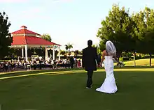 The Fresno Fairgrounds was the site of one of several temporary detention camps located throughout the West that represented the first phase of the mass incarceration of 97,785 Californians of Japanese ancestry during World War II. Pursuant to Executive Order 9066, thirteen makeshift detention facilities were constructed at various California racetracks, fairgrounds, and labor camps.[10] These facilities were intended to confine Japanese Americans until more permanent internment camps could be built in isolated areas of the country, such as Manzanar and Tule Lake in California. Beginning on March 30, 1942, all native-born Americans and long-time legal residents of Japanese ancestry living in California were ordered to surrender themselves for detention. 5,344 Japanese Americans from Fresno and the surrounding area passed through the Fresno Assembly Center before being transferred to the Jerome War Relocation Center in Arkansas and Gila River, Arizona.[11] California Historical Landmark #934 is a memorial dedicated to the more than 5,000 Americans of Japanese ancestry who were confined at the fairgrounds from May to October 1942. The marker is part of an expanded Fresno Assembly Center Memorial that lists in bronze the names of all who were incarcerated there with photos and personal commentaries by former Valley internees and their families. Banners highlighting photos from the era also educate visitors about the historical significance of the site.