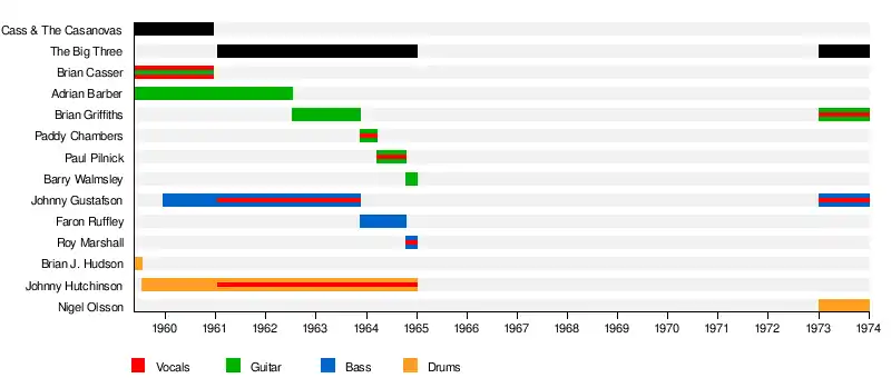 The Big Three evolved from a group called Cass and the Cassanovas, formed in May 1959 by Brian Casser as a trio comprising Casser (rhythm guitar, lead vocals), Adrian Barber (lead guitar, vocals), and Brian J. Hudson (drums) (born Brian James Hudson, 21 April 1938, Cleveland, North Yorkshire). The original line-up played at St George's Hall, Liverpool, on Friday, 15 May 1959. Johnny Hutchinson (born 18 July 1940) replaced Hudson in July 1959. In need of a bass guitarist, Hutchinson brought in Johnny Gustafson in December. At that time, Gustafson did not have a proper bass guitar, so Barber converted an acoustic for him. Gustafson's first gig was at The Tower Ballroom, New Brighton, on 31 December 1959.[3]