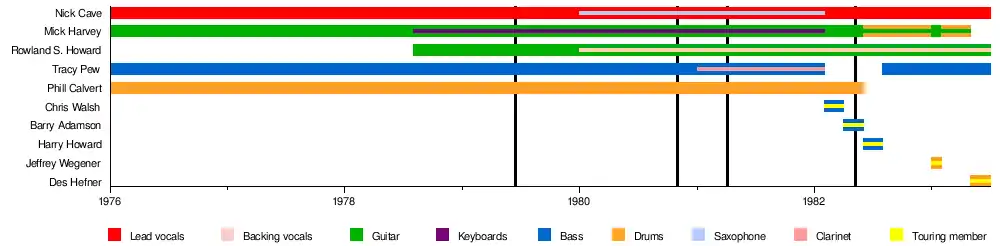 | Past members | Nick Cave Mick Harvey Tracy Pew Phill Calvert Rowland S. Howard |