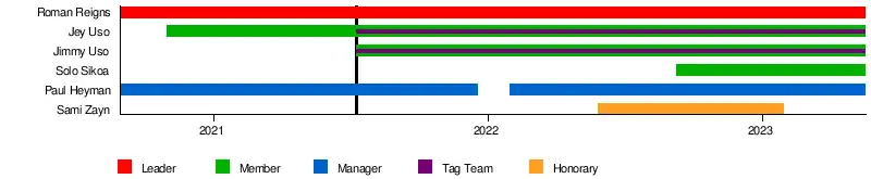 | Sami Zayn (honorary) | May 27, 2022 | January 28, 2023 | Zayn was assaulted and kicked out from the group after he attacked Reigns with a steel chair at Royal Rumble. |