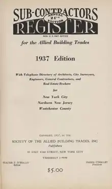 The company traces its roots to when Joseph O'Malley, president of The Society of the Allied Building Trades, first published a subcontractor's registry for New York City in 1913.[1] The Subcontractors Register for the Allied Building Trades was a directory of subcontractors for the New York City area, listing companies by their trade. It was published by Joseph O'Malley (1893–1985) who was later joined by his nephew, Walter Francis O'Malley, as editor.[2] The 1942 version calls itself: "A Classified List for the Allied Building Trades of Sub-Contractors, Material Dealers & Manufacturers, General Contractors & Builders, Architects — Engineers, Real Estate Management Firms".