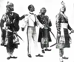 Hamish MacCunn (conductor), Robert Courtneidge (producer) and Paul Rubens on the set of The Blue Moon