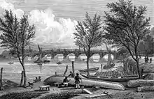 The Boat Race is an annual rowing eight competition between the University of Oxford and the University of Cambridge. First held in 1829, no attempt was made to organise the second race until 1834. Cambridge had initially proposed a race from Westminster Bridge to Hammersmith, while Oxford suggested Maidenhead.[1] Although Cambridge agreed to compromise to race on any stretch of the Thames between Westminster and Richmond, no agreement was reached until 1836. This year, both universities issued a challenge to one another, and arrangements for the event were made in a meeting at the Star and Garter pub in Putney on 16 June 1836.[2] According to a journalist for The Morning Post, there was disagreement over the length of the race, with Oxford preferring a short course of a mile and a half, while Cambridge opted for the same course as the previous year.[3] It was agreed that the race was to take place the following day along the 5.75-mile (9.3 km) stretch of river between Westminster Bridge and Putney Bridge,[2][4] a championship course for professional scullers.[5] It was also agreed that both boats would be steered by university men rather than professional coxes.[6]
