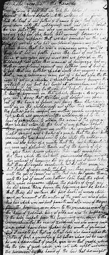 Descriptions of the way in which Smith dictated the Book of Mormon vary. Smith himself called the Book of Mormon a translated work, but in public he generally described the process itself only in vague terms, saying he translated by a miraculous gift from God.[36] According to some accounts from his family and friends at the time, early on, Smith copied characters off the plates as part of a process of learning to translate an initial corpus.[37] For the majority of the process, Smith dictated the text by voicing strings of words which a scribe would write down; after the scribe confirmed they had finished writing, Smith would continue.[38]