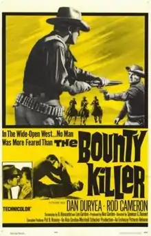 The Bounty Killer is a 1965 American Technicolor and Techniscope Western film directed by Spencer Gordon Bennet, written by Ruth Alexander and Leo Gordon, and starring Dan Duryea and Rod Cameron. The supporting cast features Audrey Dalton, Richard Arlen, Buster Crabbe, Fuzzy Knight, Johnny Mack Brown and Tom Kennedy. Broncho Billy Anderson, the cinema's first Western film star, makes his final appearance in the film.[1][2][3] The film was released on July 31, 1965, by Embassy Pictures.