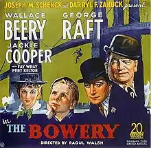 The Bowery is a 1933 American pre-Code action film set in the Lower East Side of Manhattan around the start of the 20th century directed by Raoul Walsh and starring Wallace Beery and George Raft. The supporting cast features Jackie Cooper, Fay Wray, and Pert Kelton.