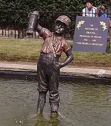 Another statue was given to the town of Cleethorpes, North East Lincolnshire, in 1918 by John Carlbom[17][18] or Calborn.[19] It is reported that he was a Swedish immigrant to Cleethorpes who had built up a successful shipping business and was the Swedish Vice-Consul,[16] and that the statue was a copy of one in the Hasselbacken Restaurant in Stockholm, Sweden.[3] The Cleethorpes statue now stands in a pond in the Diana Princess of Wales Memorial Gardens, on Kingsway. It was stolen and replaced in 2002 and 2008, and vandalised in October 2011. In July 2012, two youths were recorded on CCTV as they frolicked naked in the pond and destroyed the fountain.[20] A replacement statue was made by a local garden ornaments manufacturer and installed with improved security in September 2012.[21] A nearby pub was named The Leaking Boot, but was destroyed by fire in June 2009.[22]