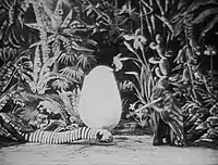 The Brahmin and the Butterfly was inspired by Buatier de Kolta's 1885 magic act Le Cocon, ou Le Ver à Soie. In the act, de Kolta drew a silkworm on paper; the paper broke to reveal a cocoon, which opened to reveal de Kolta's wife dressed as a butterfly.[1] Méliès's film maintains the links to the myth of Pygmalion and Galatea, a theme beloved of stage magicians, but gives it a new comic twist.[2] The ending of the film makes it unusual among Méliès's oeuvre: where usually his male characters lead the action and his female characters are reduced to supporting roles, here the butterfly-princess seizes control of the story and wins out over Méliès's own character.[2]