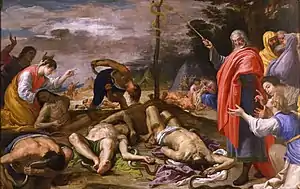 The Brazen Serpent is a 1630–1640 painting by the Aragonese artist Jusepe Leonardo, now in the Real Academia de Bellas Artes de San Fernando in Madrid. It shows the story from Book of Numbers 21: 6–9.[1] In one of the recurrent protests of the Israelites against God and Moses, they are punished by sending poisonous snakes that cause the death of many by their bite. Repentant, they beg Moses to help them. God commands Moses to make a metal sculpture (copper or bronze depending on the version) and for those bitten to fix their eyes on it. Those who do are cured of the sting. Moses, wearing a red tunic, indicates with his rod the saving action offered to the wounded.