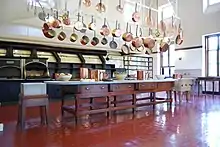 The kitchen - Kitchen – The kitchen, unlike others in the time period, was situated on the first floor away from the main house to prevent the possibility of fires and cooking smells reaching the main parts of the house. The well-ventilated room supports a 21 ft (6.4 m) cast iron stove, which heats up as a single element through a coal burning stove. The work table is made of zinc, a metal which served as the forerunner to stainless steel; in front of it is a marble mortar used to crush various ingredients. Ice cut from the local ponds kept the side rooms cool where food was stored, and facilitated a colder room for the assembling of confections.[11] The kitchen and baking pantry each have one dumbwaiter that travels to the basement level where groceries were delivered and refuse removed.