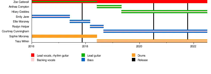 - Zoe Catterall – lead vocals, rhythm guitar (2016–present), lead guitar (2016–2018)