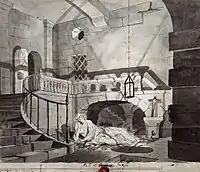 The sketch was titled The Captive King and it shows the French nobleman Guy de Lusignan held prisoner by Saladin. Lusignan had fought Saladin on 4 July 1187 and was taken prisoner following his army's defeat. It is said that the relics from the true cross were also lost during this battle.[1] Lusignan, who came from near Poitiers in France, had become the King of Jerusalem as a result of his marriage to Sibylla of Jerusalem. Eventually, Lusignan was released by Saladin and went on to rule Cyprus. The sketch by Joseph Wright contains annotations by his friend Peter Perez Burdett.[2] Wright had taken lessons from Burdett in perspective and consulted him over the construction of his paintings.