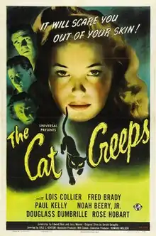 The Cat Creeps is a 1946 American horror film[3] directed by Erle C. Kenton and starring Noah Beery, Jr., Lois Collier, and Paul Kelly.[2] It follows a journalist and his photographer who attempt to research an unsolved death and locate a missing fortune, with the help of a black cat that appears to be possessed by the spirit of a dead woman.