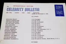 The Celebrity Bulletin is a magazine which reports on people in the arts, business, education, politics, religion, science and sports.[1][2] It was founded by society impresario Earl Blackwell (1909–1995) in 1952.[1] Originally a weekday (New York) or thrice weekly (Paris, London, Hollywood and Rome) four-page magazine,[3] it is now published bi-weekly.[4] International versions, published weekly, are also available.