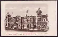 The Agricultural and Industrial Hall, also known as the Canterbury Hall, was built in 1900 at 192–194 Manchester Street.[1][2][3] The foundation stone was laid by Mayor William Reece on 14 March 1900.[4] William Clarkson and Robert Ballantyne, architects trading as Clarkson & Ballantyne, designed the building for the 50th jubilee of Christchurch, celebrating the arrival of the First Four Ships in December 1850.[3][5] The contractors were Rennie and Pearce.[4] The Canterbury Industrial Association, a branch of the New Zealand Industrial Association, was the driving force behind the building.[6] Together with the Agricultural and Pastoral Association, an Agricultural and Industrial Hall Company was formed that owned the building.[4][6] Samuel Brown, the president of the New Zealand Industrial Association, called it "possibly the finest hall in New Zealand".[6]