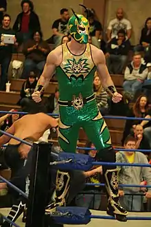 On April 23 The Colony entered the 2010 King of Trios tournament. After defeating the team of Flip Kendrick, Louis Lyndon and Johnny Gargano, The Colony handed BDK their first non-disqualification loss when they defeated the trio of Pinkie Sanchez, Tim Donst and Lince Dorado in the quarterfinals of the tournament.[27] On April 25 The Colony defeated Team Osaka Pro (Atsushi Kotoge, Daisuke Harada and Tadasuke) to make their way to the finals of the tournament, where they were defeated by the BDK trio of Ares, Castagnoli and Tursas, when referee Derek Sabato turned rudo, revealed himself as being aligned with BDK and performed a fast count to end the match.[28] On August 29, Green Ant broke his arm during a match with Keita Yano and upon his return in February 2011, Chikara started a storyline similar to that used by the World Wrestling Federation with Lex Luger in 1993, where it was claimed that Green Ant had a metal plate inserted into his arm, which resulted in strikes from that elbow being more powerful due to the plate.[29][30] Also in February, The Colony of Fire Ant and Soldier Ant secured three points and challenged Mike Quackenbush and Jigsaw for the Campeonatos de Parejas on March 13, but were unsuccessful in regaining the title.[28] On April 15, The Colony entered the 2011 King of Trios, defeating Sinn Bodhi, Kodama and Obariyon in their first round match.[31] The following day during a fan conclave, Chikara held a contest to see if anyone could be able to body slam the 375 lb (170 kg) BDK member Tursas. Green Ant entered the contest, once again copying a storyline the WWF had used with Lex Luger and Yokozuna in 1993, but before he could complete the body slam, he was tripped by BDK member Jakob Hammermeier.[32] Later that day, The Colony advanced to the semifinals of the 2011 King of Trios by defeating BDK representatives Tim Donst, Delirious and Hammermeier, after Green Ant body slammed the interfering Tursas and then submitted Hammermeier with Luger's trademark finisher, the Torture Rack.[28][33] The following day, The Colony defeated The Osirian Portal (Amasis, Hieracon and Ophidian) to advance to their second King of Trios final in a row.[28] Later that same day, The Colony defeated F.I.S.T. (Chuck Taylor, Icarus and Johnny Gargano) in the finals to win the 2011 King of Trios.[28][34] In July, Green Ant started a "Flex Express" bus tour that was featured on Chikara's video podcasts, in preparation for his singles match with Tursas, again imitating a similar tour Luger had done in 1993. One of the episodes even featured a cameo from Luger himself.[35] The match took place on July 30 and saw Tursas defeat Green Ant following interference from Jakob Hammermeier.[36] On August 27, Green Ant advanced to the finals of the ninth annual Young Lions Cup tournament, before losing to Osaka Pro Wrestling representative Tadasuke.[28] The following month, Fire Ant and Green Ant made their first tour of Osaka Pro, which culminated on September 23 in a match, where they unsuccessfully challenged Atsushi Kotoge and Daisuke Harada for the Osaka Pro Wrestling Tag Team Championship.[37][38] On November 13 at Chikara's first internet pay-per-view, High Noon, Fire Ant and Soldier Ant defeated The Young Bucks to once again earn the right to challenge for the Campeonatos de Parejas, while Green Ant ended his feud with Tursas by defeating him in a grudge match with a new submission maneuver, the Chikara Special: Green.[28][39] The Colony cashed in their points on December 2, during Chikara's special post-season JoshiMania weekend, but were defeated by the defending Campeones de Parejas, F.I.S.T. (Chuck Taylor and Johnny Gargano).[28]