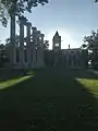 Academic Hall was constructed in 1840–1843 as the first building of the University of Missouri and the first public university building west of the Mississippi River. Accountant and architect Stephen Hills, who also designed the first Missouri State Capitol Building, designed the hall. The hall's columns were made from limestone drums from the Hinkson Creek Valley south of the campus.[4] When Academic Hall burned to the ground in 1892, the columns remained standing. In the next few months after the fire, many people thought that the Columns were an eyesore that blocked the view of the new buildings (Red Campus) being constructed on the Quadrangle. Some even worried that they were structurally unsound and a safety hazard. In August 1893, the board of curators issued a resolution that called for the Columns to be demolished "as soon as convenient". A local newspaper reported that Gideon F. Rothwell had ordered two mule teams to pull down and remove the Columns. Jerry S. Dorsey, a leading Columbia citizen, led a protest against their removal, saying that "the Columns could not be pulled down by a herd of elephants". Rothwell replied that the columns were coming down "even if he had to dynamite them." Dorsey obtained a judicial writ that halted the immediate destruction of the Columns, and an architect said they would be structurally sound. The protest from Columbia citizens and the reassurance that the Columns did not pose a safety hazard led Rothwell and the other curators to have a change of heart in December 1893, and the Columns remain.[5][6] In 2017, the columns underwent a major preservation effort.[7] In the 2017 fall semester, the University of Missouri offered a class called "The Geology of the Columns".[8]