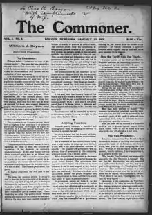 The Commoner was a weekly newspaper published in Lincoln, Nebraska, from 1901 to 1923 that was owned, edited, and published by William Jennings Bryan. The Commoner was a political paper of the early twentieth century that impacted a great deal of public opinion on critical matters.
