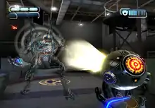 The shooting controls of The Conduit were inspired by Metroid Prime 3: Corruption and Medal of Honor: Heroes 2, first-person games which had well-received Wii control schemes.[7] The Conduit offers user customizable control features, such as the ability to alter the size of the bounding box, the speed at which the player can move the camera, and cursor sensitivity.[16] Furthermore, the player can adjust these options in real time, without having to leave the adjustment screen to try the changes. The developer also included the option for the player to change the control layout, so that any gameplay function can be mapped to any button or motion on the Wii Remote.[16] Other customizable aspects include the player's maximum running speed and the layout of the game's HUD; the elements of the HUD can be moved to different locations around the screen or removed.[17]
