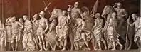 Francesco Cornaro was a Venetian patrician and his family was supposed to be descended from the Cornelia gens of ancient Rome, hence the choice of two subjects from that gens' participation in the Second Punic War. Continence is derived from a story in Livy and Valerius Maximus about the aftermath of the capture of Carthago Nova in 209 BC by Publius Cornelius Scipio. A virgin was personally delivered to him as a hostage, but she pleaded to be returned to her parents and Celtiberian fiancé. He agreed on the single condition that her fiancé would work for peace between Rome and Carthage. Just left of centre Scipio sits on a throne and refuses the gold brought to him by the woman's parents as her ransom. She stands at the foot of his throne with her fiancé, who is shown with a sword and helmet. Between Scipio and the virgin is a plaque reading TVRPIVS / IMPER / VENERE / .Q. A. / MIS AI. The more peripheral figures were painted by Bellini's studio and overall his and their figures show more animation than Mantegna's more rigid classicism, showing that Bellini had taken on board innovations by Giorgione but refused to be influenced by Dürer.