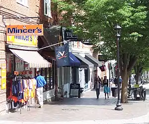 While the university is in session, The Corner is especially active at lunchtime, when faculty, staff, and students adjourn there for the midday meal. Patrons of the Corner's sidewalk cafés can be found spending time over a good book or simply sipping coffee and people watching.[2] Of the 67 businesses in the district, all but sixteen are locally owned, though there has been an increase in chain stores recently.[1] The Corner is encompassed by a Charlottesville historic district, limiting redevelopment and demolition.[1]