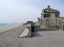 Between 1958-65, construction of a sea wall was completed, and this gave the inn and Chiswell village protection from the sea.[7] In past storms, the sea has been recorded as smashing open the pub's door and roaring into the bar as well as throwing pebbles onto the roof.[8] During the storms of January–February 2014, prime minister David Cameron arrived at Portland to show support for those affected by the storms. During his time on the island he visited The Cove House Inn.[9]