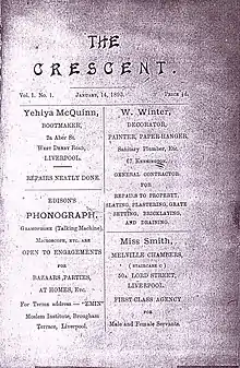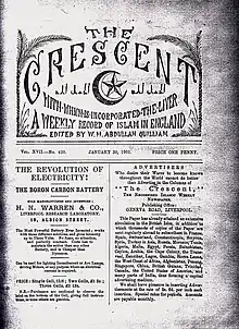 The Crescent - a weekly record of Islam in England[1] was originally published weekly in Liverpool from 1893. As such, it can claim to be oldest and first regular publication reflecting and serving the early convert[2] and Muslim community within the British Isles, although its readership quickly grew via subscription to a global community. The first edition was published on 14 January 1893 from 32 Elizabeth Street,[3] Liverpool, shortly before moving to Brougham Terrace. It was edited by W. H. Abdullah Quilliam and represented Muslims in England and growing convert community between 1893 and 1908.