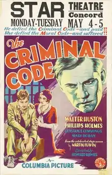 The Criminal Code is a 1931 American pre-Code romantic crime drama film directed by Howard Hawks and starring Walter Huston and Phillips Holmes. The screenplay, based on a 1929 play of the same name by Martin Flavin, was written by Fred Niblo Jr. and Seton I. Miller, who were nominated for Best Adaptation at the 4th Academy Awards but the award went to Howard Estabrook for Cimarron.