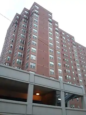 The Crittenden is a 195 foot 17-story high rise solid apartment building in The Flats of downtown Cleveland located on St. Clair Avenue.[1] The building is notable for being one of the tallest inhabited masonry loadbearing structures in the entire world.[2] The entire superstructure is made of brick and it is unusual among high rises as it is widely believed it is not possible to make tall structures completely out of brick. Despite the skinny profile of the Crittenden, it is actually quite wide with a seemingly endless expanse. The building was designed by Richard L. Bowen & Associates, a Cleveland architecture firm that is responsible for bringing architecture, engineering, and construction services under one company as opposed to many.[3] It is also the tallest all-residential structure in the flats and the Warehouse District. It was also one of the first residential towers constructed in the Warehouse District.[4]