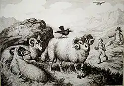 In Marie de France's 12th century version, the sheep is annoyed at having its wool pulled out.[2] Samuel Croxall retitled the tale "The Jackdaw and the Sheep" in his 1722 collection and made the sheep complain of the bird's chattering.[3] The accompanying illustration was imitated on the brownware pottery series issued by Wedgwood in 1775.[4]