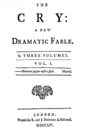 Jane Collier's and Sarah Fielding's The Cry: A New Dramatic Fable (1754) was Fielding's sixth and Collier's second and final work. The work is an allegorical and satirical novel. Collier and Fielding had worked together previously when Fielding wrote The Governess and when Collier wrote An Essay on the Art of Ingeniously Tormenting, but The Cry is the only work that can be positively ascribed to the two together.[1] Collier died the year after its publication.