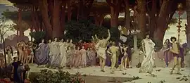 In the Academy exhibition of 1876, with The Daphnephoria, Leighton once more chose a classic theme, for a painting which, by its composition, reminded the critics and lovers of art of the artist's early success with the Cimabue's Madonna, and of his other large processional picture, the Syracusan Bride.[3] The work was painted for Stewart Hodgson. He paid £1,500 for it, and Leighton gave him all the studies he made for it.[4] It was later acquired by Lord Leverhulme, and was transferred from his private collection to the Lady Lever Art Gallery in 1922.