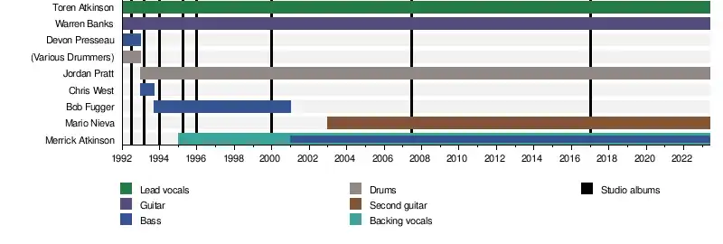 The original three members of the band, at the January 1992 formation, were Toren Atkinson, Warren Banks and Quentin Rogers. Quentin, though, never appeared on any of their releases, nor played at any of their public performances. The first bass player to appear with the band at a show was Devon Presseau.[43] The band has gone through several bassists and drummers since its inception. Thomas R. Falk has toured and played with the band as a second guitarist.