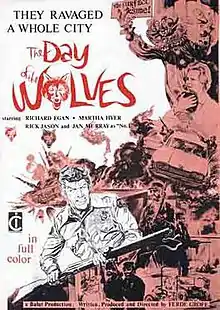 The Day of the Wolves is a 1971 heist movie starring Richard Egan and directed, written and produced by Ferde Grofe Jr. the son of the renowned composer, Ferde Grofe, who had previously worked in the Philippine film industry. It was the first movie to be made on location in the new town of Lake Havasu City, Arizona. This was the last feature film made by actress Martha Hyer and was also the last film made by actor Percy Helton who died about five months after filming wrapped (Helton's last released film was Legend of the Northwest, released in 1978 but made in the 1960s and shelved for a decade).