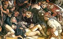 The study, copied for the wall painting, was created in 1859–64 and is organised as a frieze, in a long narrow format. It shows the dying Admiral Nelson on the deck of HMS Victory, cradled in the arms of Captain Hardy, with other figures, including Dr Beatty, leaning over him. They are surrounded by members of the crew. Maclise took trouble over the accuracy of details in the picture; he interviewed survivors of the battle and researched the naval equipment in use at the time.[3] However the painting is not an accurate account of the event, because Nelson was quickly taken below decks, where he died; it is rather an idealisation of the event.[2] Included in the painting are two black people; this is likely to be historically accurate as two men from Africa were included in the crew of HMS Victory. At this time people of African descent were integrated with other members of the crew, although they tended to work in the lower ranks. One of the Africans is pointing towards the assassin of Nelson.[3]