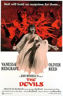 In November 1965, following the Broadway opening of John Whiting's 1961 play The Devils — which was based on Aldous Huxley's nonfiction book The Devils of Loudun (1952), about the alleged 17th-century possessions in Loudun, France — producer Alexander H. Cohen announced plans to adapt the play for film, revealing that he had made a formal offer to Huxley's estate for the rights. After Cohen's deal failed to be materialize, United Artists signed a deal with producer Robert H. Solo to make the adaptation in August 1969.[1] Following the success of Ken Russell's Women in Love (1969) in the United States, United Artists suggested to Russell that he adapt The Devils of Loudun. According to journalist John Baxter and Russell's widow Lisi Tribble, he was familiar with the story by the time United Artists proposed the project to him, having watched a production of Whiting's play in London and subsequently being inspired to research its historical basis.[3][4] Russell said that "when I first read the story, I was knocked out by it — it was just so shocking—and I wanted others to be knocked out by it, too. I felt I had to make it."[5] Russell later said at the time he made the film: "I was a devout Catholic and very secure in my faith. I knew I wasn't making a pornographic film... although I am not a political creature, I always viewed The Devils as my one political film. To me it was about brainwashing, about the state taking over."[5] Though Russell admired Whiting's play, his screenplay mainly drew from Huxley's book as he found the play "too sentimental."[1]