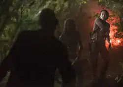 Rick, Michonne, Glenn, and Aaron take the lead in the car, while the rest of the group follow a short distance behind in the RV. On the way, Michonne is looking at the pictures that Aaron has given her and she asks him why he has no pictures of his people. He says that he did take one picture but that he had got the exposure wrong and it didn't develop. Michonne asks Rick if he has given Aaron their own audition interview. Aaron answers that he has killed "lots" of walkers, but only two people, and only then because they were trying to kill him. At that point Rick then finds a parabolic microphone in the car and expresses concern that Aaron's people might have heard their plans. Rick's outburst distracts Glenn, who drives into a herd of walkers on the dark, unscouted highway. Coming out the other side, they lose sight of the RV and conclude it backed away from the herd. After the car fails to start, they see a flare go off and Aaron bolts into the woods, pursued by Glenn. After close calls for each, Glenn cuts Aaron free and returns his pistol, and together they return to the car to save Rick and Michonne from the herd. The four of them head for the flare and reunite with the RV group who have rescued Aaron's partner and boyfriend, Eric (Jordan Woods-Robinson).