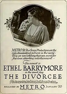 The Divorcee is a 1919 American society drama starring Ethel Barrymore in her last silent feature film. The film is based on a 1907 play, Lady Frederick by young Somerset Maugham, which had starred Barrymore on Broadway.[2] The play was already quite dated when this film was made, but the actress was always comfortable with this kind of soap-operish melodramatic material. Herbert Blaché directed, and June Mathis wrote the scenario based on Maugham's play. The film was produced and distributed by the Metro Pictures company.