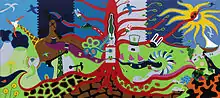The theme of this art work is live with energy. Figurative imagery in the painting tells the story of the history of energy production. There are four sub designs based on the four elements of life: earth (raw energy), water (hydroelectric power), fire (solar energy) and air (wind power). Each sub-design presents the combination or contrast of old and new forms of energy production and their applications (the sciences). In addition to these four fundamental themes, there is a single, central figure: the tree. The tree is a metaphor for life, energy, growth, development, and change. The province of Drenthe with its rich history of peat production is also represented in the painting. In addition, in the form of standalone motifs, general applications or containers of energy such as ecobunny lights and battery-insects can be seen moving throughout the whole painting.[3]
