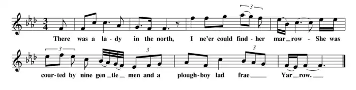 In some versions, the lady (who is not usually named) rejects a number (often nine) wealthy suitors, in preference for a servant or ploughman. The nine make a pact to kill the other man and they ambush him in the "Dens of Yarrow".