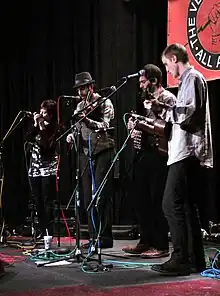 The Down Hill Strugglers, previously known as the Dust Busters, is an American old-time string band trio from Brooklyn, New York, United States.[1] Formed in 2008, the band has been influenced by the music that came out of rural America, including Appalachian traditions, music from the Deep South, and the Western States. The band was originally made up of Craig Judelman, Eli Smith, and Walker Shepard. In 2012, Craig Judelman left the Dust Busters and was replaced by multi-instrumentalist Jackson Lynch. At that time, the band changed its name to the Down Hill Strugglers.