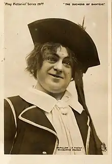 The musical adaptation followed a celebrated production of an English version of the original French play, translated by J. Comyns Carr and starring Henry Irving and Ellen Terry.[4] The original production of The Duchess of Dantzic, produced by Edwardes, opened at the Lyric Theatre in London on 17 October 1903 and ran for 236 performances. It was directed by Robert Courtneidge, choreographed by Willie Warde and had scenery by Joseph Harker and costumes by Percy Anderson. The score was generally admired, although called old-fashioned.[5]