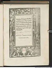 The concept of "philosophia Christi," Erasmus' primary topoi in Christian Prince, as defined by Erika Rummel as "a life centered on Christ and characterized by inner faith rather than external rites,"[21] was introduced more than a decade prior to the Christian Prince in a similar work, the Enchiridion Militis Christiani, (1504), the Handbook (or Dagger) of a Christian Soldier. At the conclusion of the preface, Erasmus, on the basis of this "philosophia Christi," admonishes the prince that "among the countless distinctions which under God your merit will win for you, it will be no small part of your reputation that Charles was a prince to whom a man need hesitate to offer the picture of a true and upright Christian prince without flattery, knowing that he would either gladly accept it as an excellent prince already, or wisely imitate it as a young man always in search of self-improvement."[13]