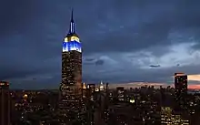 The building was originally equipped with white searchlights at the top. They were first used in November 1932 when they lit up to signal Roosevelt's victory over Hoover in the presidential election of that year.[58] These were later swapped for four "Freedom Lights" in 1956.[58] In February 1964, flood lights were added on the 72nd floor[59] to illuminate the top of the building at night so that the building could be seen from the World Fair later that year.[60] The lights were shut off from November 1973 to July 1974 because of the energy crisis at the time.[61] In 1976, the businessman Douglas Leigh suggested that Wien and Helmsley install 204 metal-halide lights, which were four times as bright as the 1,000 incandescent lights they were to replace.[62] New red, white, and blue metal-halide lights were installed in time for the country's bicentennial that July.[61][63] After the bicentennial, Helmsley retained the new lights due to the reduced maintenance cost, about $116 a year.[62]