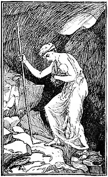 The second part of the tale follows Aarne-Thompson tale type 425A, "The Search for the Lost Husband": the maiden breaks a taboo or burns the husband's animal skin and, to atone, she must wear down a numbered pair of metal shoes.[10] On her way to her husband, she asks for the help of the Sun, the Moon and the Wind.[11][8] According to Hans-Jörg Uther, the main feature of tale type ATU 425A is "bribing the false bride for three nights with the husband".[12][13][lower-alpha 1] Others of this type include The Black Bull of Norroway, The Brown Bear of Norway, The Daughter of the Skies, East of the Sun and West of the Moon, The Tale of the Hoodie, Master Semolina, The Sprig of Rosemary, The Enchanted Snake, and White-Bear-King-Valemon.[15] In Balkanic variants of the tale type, the husband curses his wife not to give birth to their child until she has sought him out.[16]