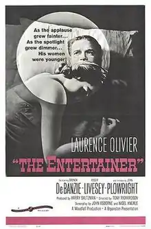 The Entertainer is a 1960 British kitchen sink drama film directed by Tony Richardson, produced by Harry Saltzman and adapted by John Osborne and Nigel Kneale from Osborne’s stage play of the same name.[7] The film stars Laurence Olivier as Archie Rice, a failing third-rate music-hall stage performer who tries to keep his career going even as the music-hall tradition fades into history and his personal life falls apart.[8] It was filmed on location in the Lancashire seaside town of Morecambe.[8][9] Olivier was nominated for an Oscar for Best Actor in a Leading Role.[10]